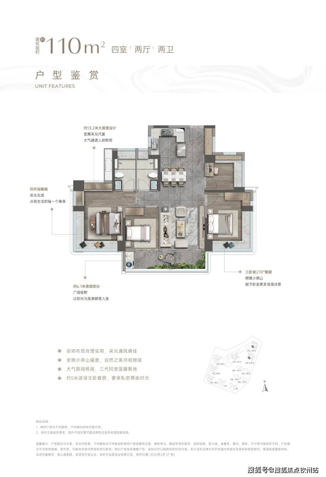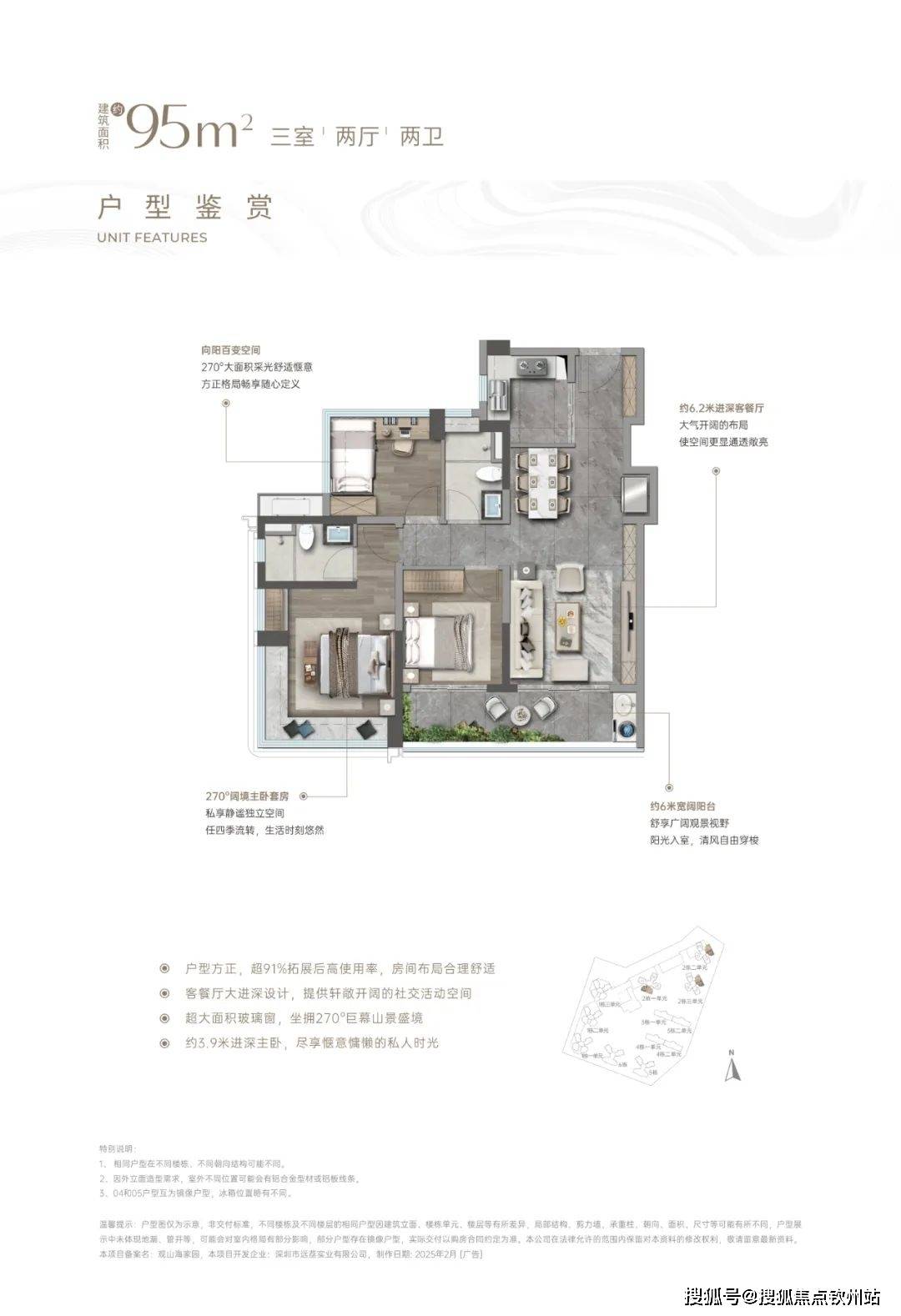 该户型为3房2厅2卫的竖厅设计,有约6米宽的观山宽景阳台,主卧有「约3.9米进深+270°观景飘窗」,一次卧有270°飘窗带大面积采光,综合空间使用率约91%,空间非常奢阔。